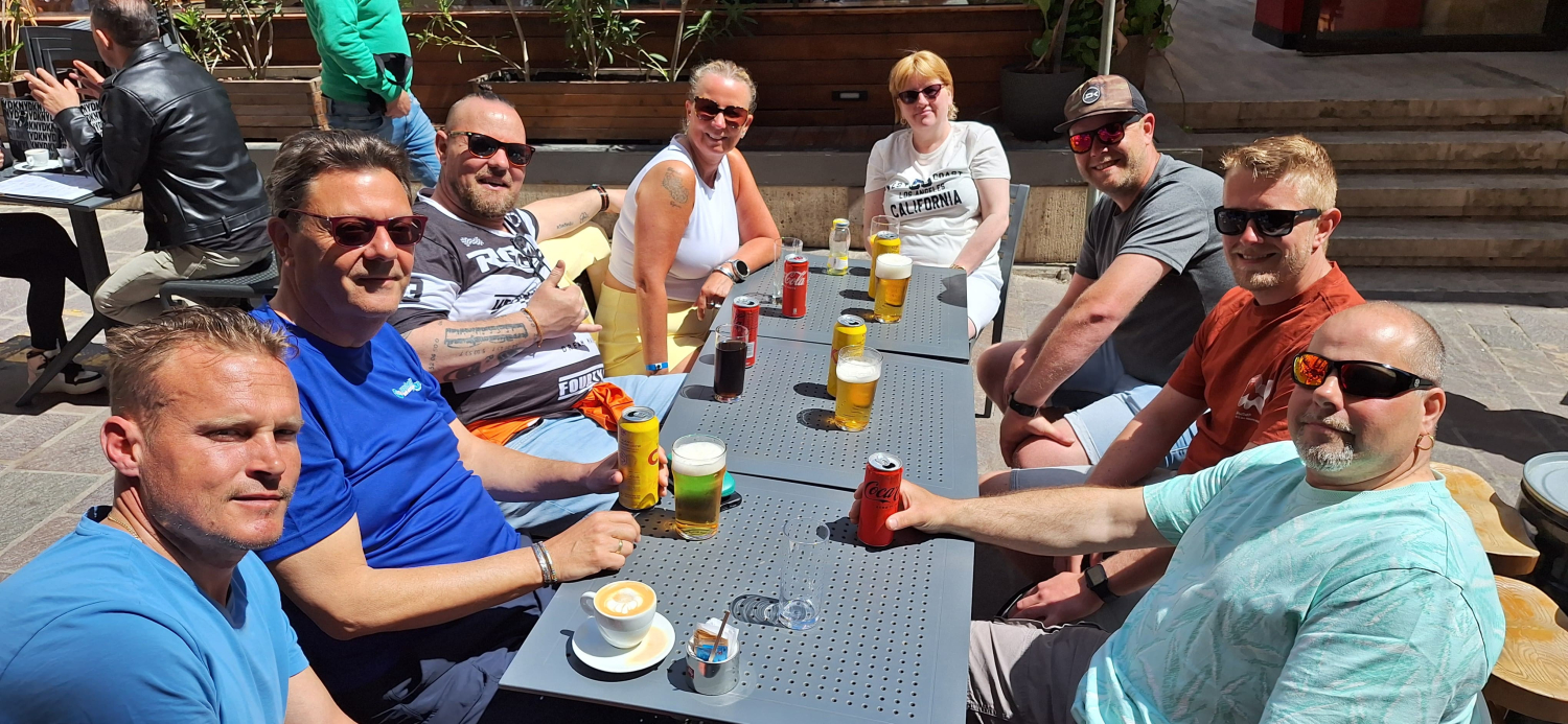 Daar splitsten we ons op — nou ja, soort van — want het grootste deel van ons liep gezellig samen, struinde door de straatjes, hopte van terras naar terras, en… vergat massaal de zonnebrand. Jep. Dag 7: de dag dat iedereen dacht dat de zon wel meeviel en nu rondloopt met rode neuzen, verbrande schouders en het subtiele gevoel alsof je op een BBQ hebt gelegen.