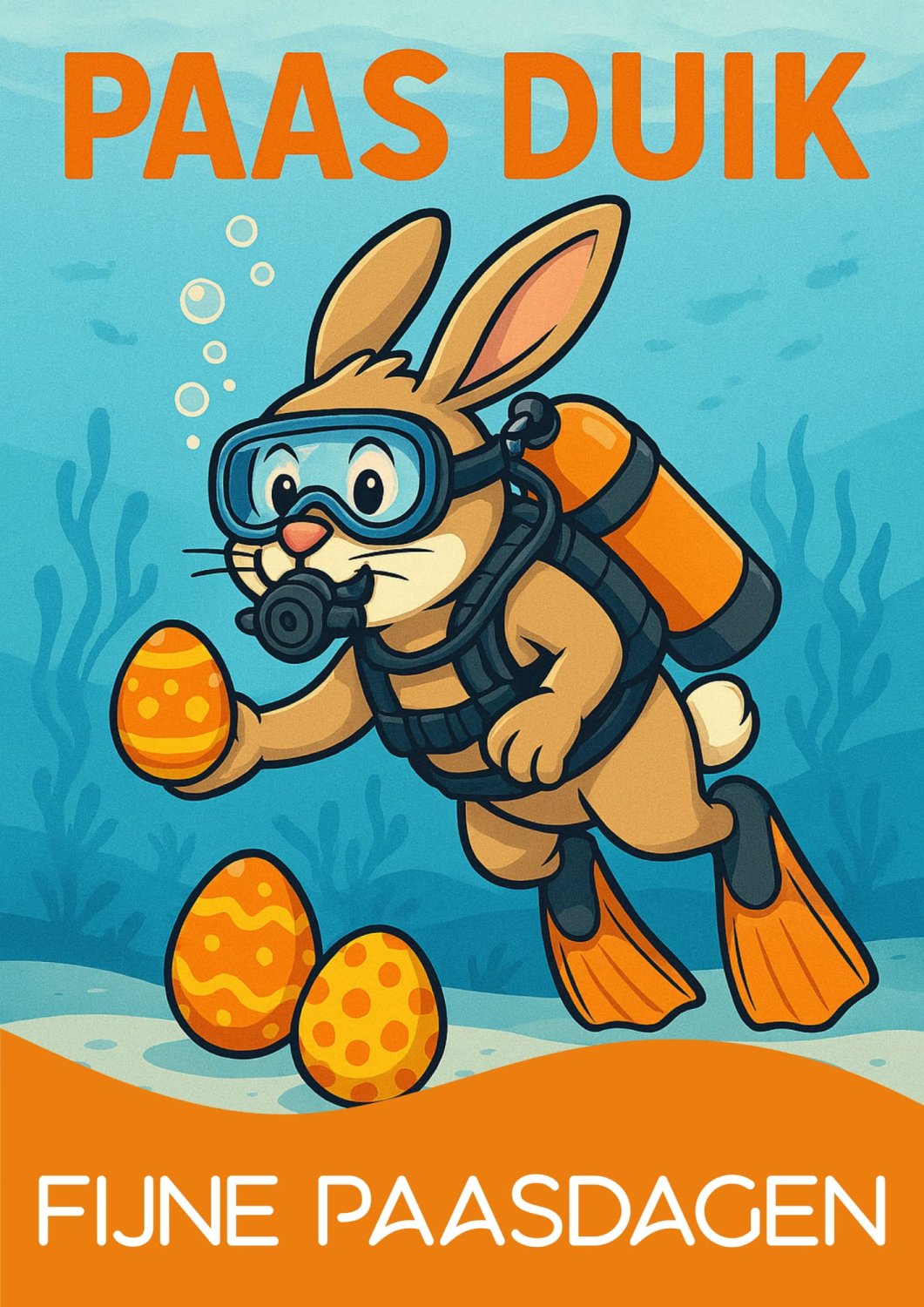 Vanmorgen waren onze twee helden van de dag – Jan & Kees – al vroeg te water 🕘🐰. Niet om vissen te knuffelen (al zou dat ook best een leuke uitdaging zijn), maar om de paaseieren te verstoppen! 🥚🤿